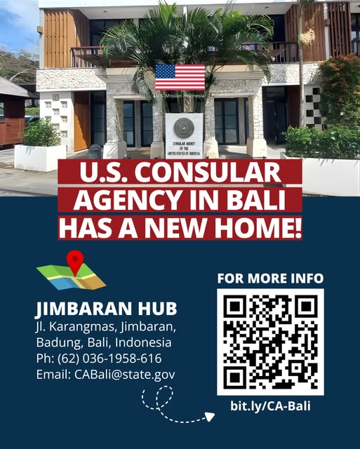 Effective 26 January 2026, the U.S. Consulate has vacated it office on Jalan Hayum Wuruk in Denpasar to reopen a new office in Jimbaran.